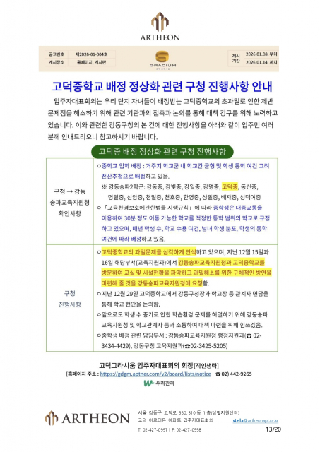 [2026-02-06]고덕 아르테온 입주자대표회의, 강동송파 2학군 고덕 지역 중학교 신입생 배정 공개 및 검증 촉구