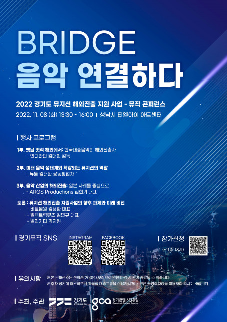 경기콘텐츠진흥원(원장 민세희, 이하 경콘진)이 국내외 연사가 참가하는 뮤직 콘퍼런스를 11월 8일 성남 티엘아이 아트센터에서 개최한다고 밝혔다. ‘2022 경기도 뮤지션 해외 진출 지원사업’으로 진행하는 뮤직 콘퍼런스는 ‘BRIDGE 음악 연결하다’라는 주제로 음악의 현재와 미래, 음악과 IT 기술의 융합, 해외 진출과 교류 등을 주제로 업계 전문가가 발제할 예정이다. 첫 번째 세션은 독립영화사 인디라인 대표인 김대현 감독이 ‘한국 대중음악의 해외 진출사’에 대해 발제하고 이어서 AI 음악기술 기업 뉴튠(NEUTUNE) 김태...