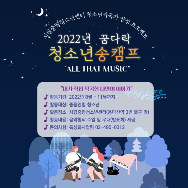 시립중랑청소년센터(박충서 관장)는 청소년들이 직접 작곡한 음악을 공개하는 송캠프 발표회를 11월에 개최·진행한다고 27일 밝혔다. 송캠프 발표회는 시립중랑청소년센터가 6월 문화체육관광부가 주최하고, 한국문화예술교육진흥원이 주관하는 ‘2022 꿈다락 토요문화학교 청소년 송캠프’ 운영 기관으로 선정돼 총 13회기로 구성된 프로그램 ‘All that music (이하 송캠프)’을 진행하고 있다. 이번 송캠프는 기존의 단일 방향 음악 지식 전달 교육에서 탈피해 청소년들이 주체적으로 음악 창작 활동을 할 수 있도록 지원하는 프로그램...
