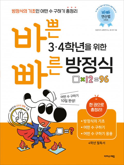 이지스에듀가 방정식의 기초인 ‘어떤 수 구하기’를 총정리하는 책, ‘바쁜 3·4학년을 위한 빠른 방정식(이하 바빠 3·4학년 방정식)’을 출간했다. ‘어떤 수 구하기(□ 안의 값 구하기)’는 1학년부터 6학년까지 초등 전학년 수학 교과서에서 빠지지 않고 나오는 내용으로, 아이들이 시험 문제에서 가장 많이 틀리는 유형 중 하나이다. 자기 학년에 나오는 ‘어떤 수 구하기’ 내용을 제대로 익히지 못한 채 넘어가면 다음 학년에서 큰 어려움을 느끼게 되므로 수학 시험에서 고득점을 받으려면 학년에 맞춘 집중 훈련이 꼭 필요하다. ...