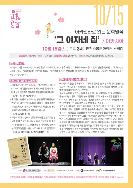 인천광역시가 인천예총에 위탁한 인천수봉문화회관은 이번 2022년 기획공연의 마지막 공연으로 ‘2022 문예회관과 함께하는 방방곡곡 문화공감사업’에 선정된 ‘그 여자네 집’을 10월 15일 토요일 오후 3시 인천수봉문화회관 소극장에서 진행한다. 2022 문예회관과 함께하는 방방곡곡 문화공감은 한국문화예술회관연합회가 주최해 문화소외지역 주민을 대상으로 다양한 문화 향유 기회를 제공해 문화양극화의 해소를 돕는 사업이다. 그 중 인천수봉문화회관에 선정된 공연인 ‘그 여자네 집’은 뮤지컬적 요소와 아카펠라를 가미해, 고(故) 박완서 ...