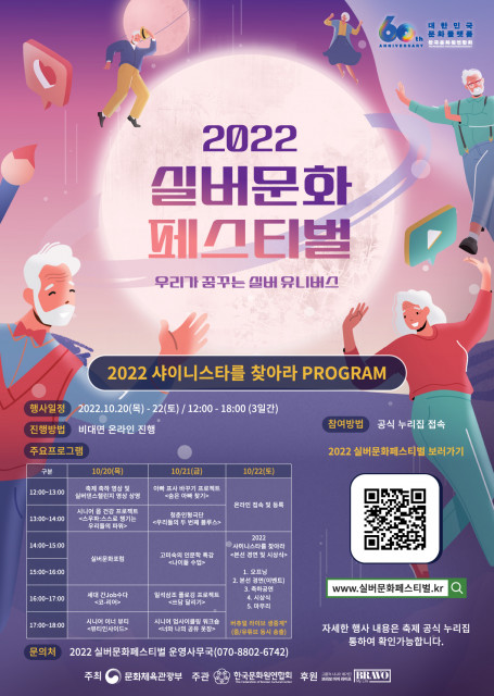 문화체육관광부(장관 박보균, 이하 문체부)가 주최하고 한국문화원연합회(회장 김태웅, 이하 한문연)가 주관하는 ‘2022 실버문화페스티벌’이 10월 20일(목)부터 22일(토)까지 실버문화페스티벌 공식 누리집에서 온라인으로 펼쳐질 예정이라고 밝혔다. 올해 2022 실버문화페스티벌의 ‘샤이니스타를 찾아라’는 전국 16개 지역에서 치열한 심사를 거쳐 예선을 통과한 16개팀이 10월 22일 본선에 출전해 경연에 참여한다. 샤이니스타를 찾아라 본선 심사는 사전 투표(누리집)와 현장 문자 투표 그리고 전문 심사위원 5인의 심사 결과를 ...