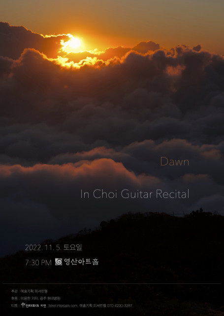 피셔인젤예술기획은 기타리스트 최인의 독주회를 11월 5일 오후 7시 30분 영산아트홀에서 개최한다고 4일 밝혔다. 해를 거듭할수록 깊이를 더해가며 새로운 시도와 다양한 구성으로 클래식 음악의 새로운 레퍼토리를 개척하는 그는 이번 독주회에서 ‘DAWN’이란 부제로 올해 작곡한 그의 신곡들과 팬들의 꾸준한 사랑을 받는 창작곡들을 무대에 올린다. 최인의 음악은 삶에 대한 은유다. 그동안의 작업에서 그는 우리나라의 아름다운 풍경을 소재로 한 곡들을 많이 작곡했지만, 그것은 단순히 눈에 보이는 것들의 아름다움만을 노래한 것이 아니다....