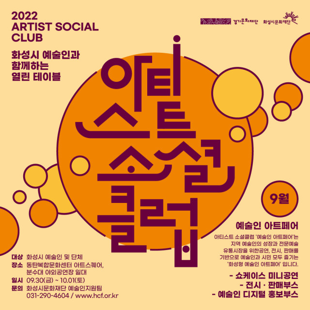 화성시문화재단(대표이사 김종대)이 화성시에서 활동 중인 예술인과 예술 작품을 홍보하고, 시민과 공유하고자 ‘예술인 아트페어’를 9월 30일(금)과 10월 1일(토) 동탄복합문화센터에서 개최한다. 예술인 아트페어는 경기문화재단 경기문화협력망 지원 사업에 3년 연속 선정된 사업인 ‘아티스트 소셜클럽’의 하나로 진행하는 사업이다. 올해 아티스트 소셜클럽은 예술인들의 네트워크 활성화를 목적으로 예술인 네트워크 간담회와 예술인 아트페어 등의 사업을 추진한다. 이번 행사는 △쇼케이스 공연 △전시 및 판매 부스 △예술인 디지털 홍보 부스...