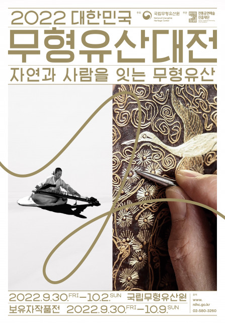 전통공연예술진흥재단(이사장 김삼진)은 9월 30일(금)부터 10월 2일(일)까지 ‘2022 대한민국 무형유산대전’을 국립무형유산원에서 개최한다. 자연에서 재료와 영감을 얻어 사람을 통해 대대손손 이어가는 무형유산의 존재가치와 의미를 담아 ‘자연과 사람을 잇는 무형유산’이라는 주제로 3일간 13회의 공연과 공예 부문 보유자 작품전, VR 등 무형유산 디지털체험, 상설전시, 체험 등이 진행된다. ‘2022 대한민국 무형유산대전’은 2016년 ‘대한민국 무형문화재대전’이란 명칭으로 시작돼 올해 6번째 해로 전통공연예술진흥재단 주관으...