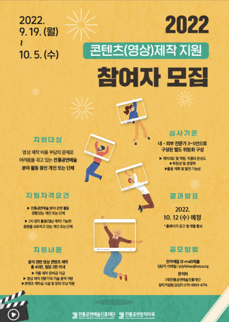 전통공연예술진흥재단(이사장 김삼진)은 코로나19 이후 활동과 수입이 감소하며 창작활동에 어려움을 겪는 전통 분야 예술인들을 지원하기 위해 ‘2022 콘텐츠(영상) 제작 지원’ 참여자 공모를 진행한다. 이번 공모는 7월 모집한 ‘2022 콘텐츠(음원) 제작 지원’ 공모 사업의 후속으로 전통공연예술진흥재단이 운영하고 있는 창·제작 시설 전통공연창작마루의 콘텐츠제작실 시설과 장비 지원뿐 아니라 영상 제작 전문가 매칭까지 영상 제작에 필요한 작업을 무상 지원한다. 또한 촬영 소품 및 의상 준비를 위한 작품 제작준비금을 팀당 최대 1...
