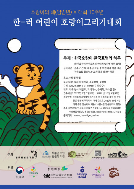 한국범보전기금이 호랑이의 해에 10주년을 맞아 2022년 제10회 ‘한-러 어린이 호랑이그리기대회’를 개최한다. ‘한-러 어린이 호랑이그리기대회’는 한국과 러시아 어린이들에게 한국호랑이·한국표범을 알리고, 이들이 살아 남아있는 북한-중국-러시아 국경지역 서식지와 생태계의 중요성을 알리기 위한 대회다. 대회 주제는 ‘한국호랑이·한국표범의 하루’며, 어린이들이 상상하는 한국호랑이·한국표범의 생태적 일상에 대한 묘사를 담고 있으면 된다. 유치원생부터 초등학생, 중학생까지 참가할 수 있고, 재료는 페인트, 크레파스, 수채화 등...
