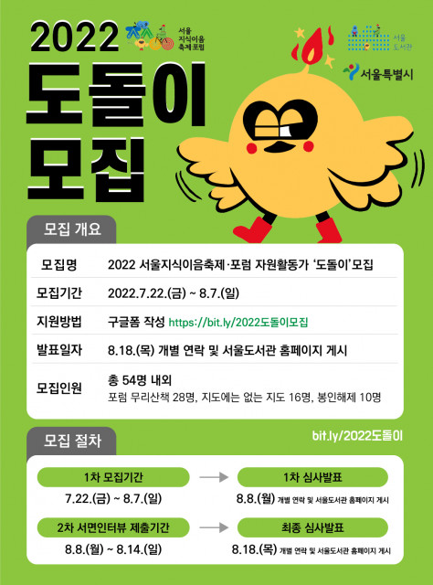 서울도서관이 8월 7일까지 ‘2022 서울지식이음축제·포럼’의 시민 활동가 ‘도돌이’ 54명을 모집한다. 서울지식이음축제·포럼은 이제까지의 책과 도서관, 그 너머의 지식을 경험하고 공유하는 축제다. 도돌이는 ‘도서관을 나의 일상으로 돌려주는 이’를 줄인 말로, 사람과 지식, 사람과 문화를 잇는 축제를 함께 만들고, 다양한 사람들과 기꺼이 즐길 준비가 된 서울지식이음축제·포럼의 활동가다. 도서관과 문화, 홍보 등에 관심 있는 고등학생 이상의 누구나 참여할 수 있다. 서울지식이음축제·포럼은 2019년 서울도서관이 매년 ...