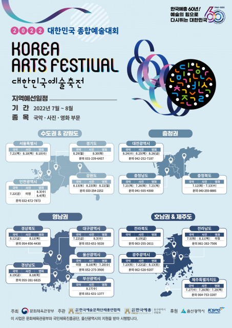 한국예술문화단체총연합회(회장 이범헌, 이하 한국예총)가 주최하는 2022 대한민국예술축전의 예선전이 7월 1일(금)부터 8월 31일(수)까지 16개 광역시·도 연합회의 주관으로 개최된다. 이번 경연 종목은 3개 분야(국악, 사진, 영화)며, 참가 대상은 동일 분야에서 장관급 이상의 수상 경력이 없고 공공기관이나 준공공기관의 정규 직원으로 소속돼 있지 않은 개인 및 단체, 만 19세 이상의 일반인이면 누구나 참여할 수 있다. 거주 지역에 해당하는 연합회의 홈페이지에서 신청할 수 있다. 예선에서 선발된 각 지역의 대표단은 10...