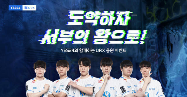 대한민국 대표 서점 예스24(대표 김석환)가 롤 프로게임 구단 DRX의 2022 리그 오브 레전드 챔피언스 코리아(이하 LCK) 서머 시즌의 선전을 응원하는 이벤트 ‘도약하자 서부의 왕으로!’를 8월 7일까지 진행한다. ‘도약하자 서부의 왕으로!’ 첫 번째 이벤트 ‘2행시 응원 딜교’는 예스24 회원이라면 예스24 공식 홈페이지에서 누구나 참여할 수 있다. 제시어 ‘도서’로 DRX를 응원하는 내용이 담긴 2행시와 응원 내용에 어울리는 책을 이벤트 페이지에 댓글로 남기면, 추첨을 통해 △22’ Summer Authentic S/...