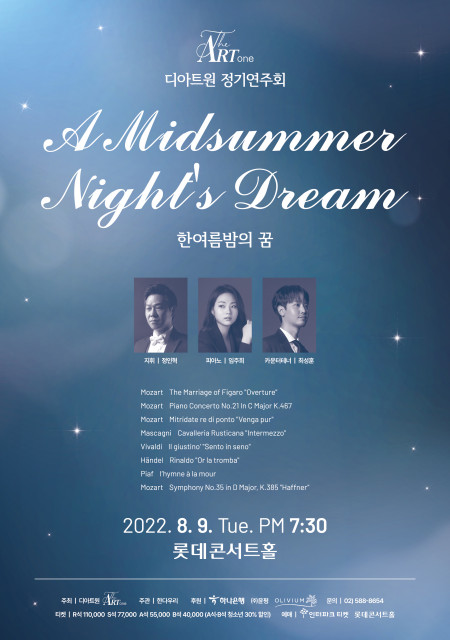 주관사 한다우리 예술기획은 한여름밤 클래식 음악으로 하늘을 수놓을 아름다운 음악회를 8월 9일(화) 저녁 7시 30분 롯데 콘서트홀에서 선보인다고 19일 밝혔다. 피아니스트 임주희, 카운터 테너 최성훈, 지휘자 정인혁과 디아트원이 그려내는 한여름밤의 꿈 음악회에서는 △모차르트 피가로의 결혼 서곡 △모차르트 피아노 협주곡 21번 C장조 K.467 △모차르트 미트리다테의 ‘여기 오세요’ △비발디 일 지우스티노의 ‘눈물의 비’ △마스카니 카발레리아 루스티카나 간주곡 △헨델 리날도의 ‘이제 축제의 나팔소리가’ △에디트피아프 사랑의 찬...