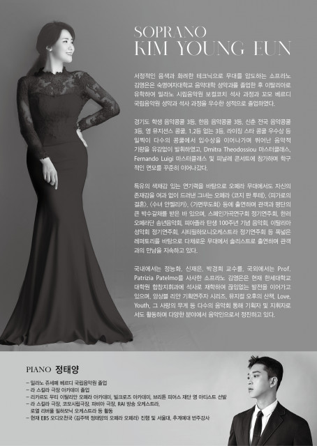 클래시크는 서정적인 음색과 화려한 테크닉으로 무대를 압도하는 소프라노 김영은이 7월 21일 (목) 저녁 7시 30분 영산아트홀에서 귀국독창회를 개최한다고 밝혔다. 그가 준비한 레퍼토리는 오페라 아리아와 가곡 등 다채로운 작품들로 구성해 공연을 찾아온 관객들에게 흥미로운 무대를 선사할 것으로 기대된다. 소프라노 김영은은 숙명여자대학교 음악대학 성악과를 졸업한 후 이탈리아로 유학해 밀라노 시립음악원 보컬코치 석사 과정과 꼬모 베르디 국립음악원 성악과 석사 과정을 우수한 성적으로 졸업했다. 그는 경기도 학생 음악콩쿠르 3등, 한...