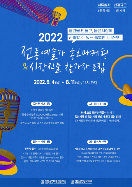 전통공연예술진흥재단(이사장 김삼진)은 ‘2022 전통예술가 역량강화’ 사업의 하나로 전통 분야 예술단체들의 음원 제작과 홍보마케팅 업무 수행을 돕는 ‘홍보마케팅 및 시장 진출 프로그램’을 진행한다. 이번 현장 교육 프로그램은 참여 예술단체가 음원 제작 및 마케팅 전문 기획사와 협업해 음원을 제작하고, 저작물 등록, 스트리밍 플랫폼 유통, 홍보마케팅 등 일련의 업무들을 수행한다. 이를 통해 시장진출 과정을 처음부터 끝까지 체험하면서 음원 시장에 대한 이해도를 높이고 시장 내 자생력을 키울 수 있을 것으로 기대된다. 접수는 8월...