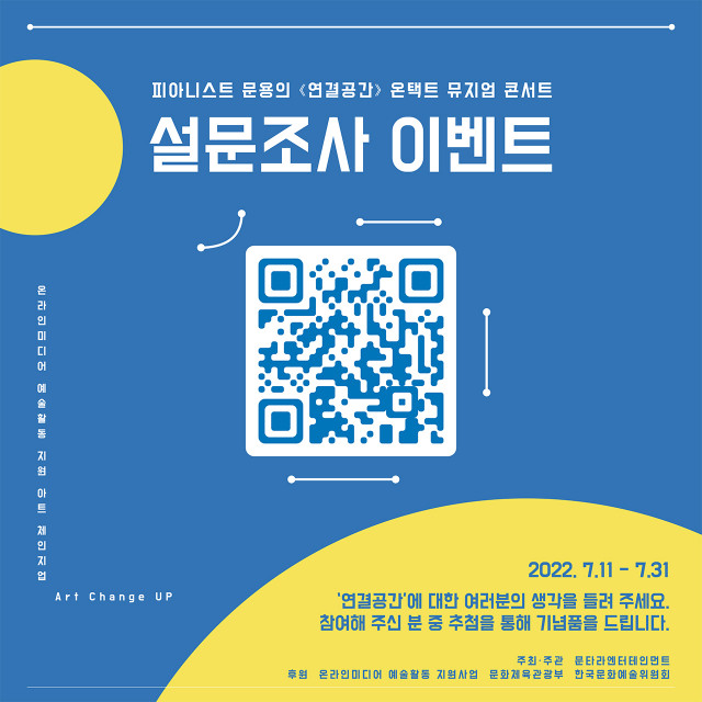 문타라엔터테인먼트가 피아니스트 문용의 ‘연결공간’ 온택트 뮤지엄 콘서트에 대한 만족도 조사 및 의견 수렴을 위해 7월 11일부터 31일까지 설문 조사 이벤트를 진행한다. ◇추첨 후 기념품 증정, 소셜 미디어 인증 사진 올리면 당첨 확률 UP 이벤트 응모는 이벤트 포스터 이미지 내 QR 코드 또는 링크를 통해 접속, 설문 조사에 응하면 완료된다. 문타라엔터테인먼트는 이벤트 참여자 가운데 50명에게 추첨을 통해 연결공간 기념품을 증정할 계획이다. 특히 소셜 미디어에 ‘#연결공간’ 해시태그와 함께 문용의 유튜브 공식 아티스트 ...