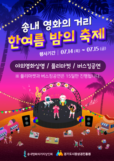 경기도시장상권진흥원과 부천 송내 영화의거리 상인회(회장 박광용)는 7월 14일부터 15일까지 ‘2022년 송내 영화의거리 한여름 밤의 축제’가 시작한다고 8일 밝혔다. 부천판타스틱영화제 기간에 발맞춰 진행되는 이번 행사는 14일(목) 저녁 7시 야외 영화 상영, 15일(금) 오전 10시 프리마켓 및 오후 1시 공연 행사 등 다양한 프로그램이 마련됐다. 행사는 경기도 예산을 지원받는 경기도시장상권진흥원의 공모 지원 사업에 선정되며 추진됐다. 송내 영화의거리 상인회가 주관해 진행한다. 박광용 송내 영화의거리 상인회장은 “볼거...