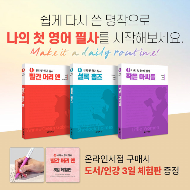 출판사 다락원은 원어민이 쉽게 다시 쓴 ‘나의 첫 영어 필사’ 3권 시리즈를 출간했다. ‘나의 첫 영어 필사’ 시리즈는 외국 문학 작품 속 원서를 리라이팅해 초급자도 쉽고 재미있게 읽고 필사할 수 있는 책이다. ‘나의 첫 영어 필사’는 ‘빨간 머리 앤’, ‘셜록 홈즈’, ‘작은 아씨들’ 등 총 3권으로 구성됐다. 각 원서에 맞춰 읽기-필사하기-응용하기 순서로 매일 30분 영어 공부 루틴을 만들 수 있도록 도움을 준다. 이 책의 편집자는 “타사 필사책과는 달리 단순히 베껴 쓰는 것에서 끝나는 것이 아닌, 필사 앞뒤로 읽기와 응...