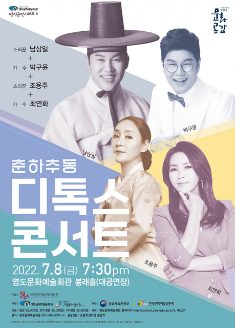 소리꾼 남상일, 조용주, 가수 박구윤, 최연화의 컬래버 공연 ‘춘하추동 디톡스콘서트’가 영도문화예술회관을 찾아온다. 영도문화예술회관은 7월 8일(금) 오후 7시 30분 영도문화예술회관 봉래홀(대공연장)에서 ‘춘하추동 디톡스콘서트’가 개최된다고 30일 밝혔다. 디톡스콘서트는 ‘한국문화예술회관연합회 방방곡곡문화공감 공모사업’에 선정된 공연 가운데 두 번째 작품이다. 한국문화예술회관연합회가 주최하고, 영도문화예술회관이 주관하며, 문화체육관광부와 한국문화예술위원회가 후원한다. 춘하추동 디톡스콘서트는 전통 음악을 기반으로 판소리 고...