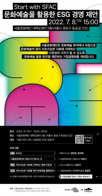 서울문화재단(대표이사 이창기)이 문화예술 분야에서는 처음으로 문화예술을 활용한 ESG (Environment Social Governance, 환경·사회·지배 구조) 경영을 제안하는 기업 대상 설명회를 7월 8일(금) 오후 3시 서울문화재단 대학로센터에서 개최한다고 밝혔다. 이번 설명회는 팬데믹 이후 사회 전반으로 확장 중인 투명하고 지속 가능한 경영에 대한 관심과 요구에 맞춰 문화예술을 활용한 사회 공헌 프로그램에서 한 발 나아가 문화예술이 사회에 기여할 수 있는 가치와 역할을 확대하기 위해 개최됐다. 기업·기관의 E...
