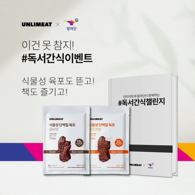 인터넷 서점 알라딘이 국내 대체육 브랜드 언리미트와 함께 독서 간식 이벤트를 13일 진행한다고 밝혔다. ‘알라딘 X 언리미트 독서간식 이벤트’는 언리미트 식물성 육포 제품의 알라딘 독서 간식 입점 소식 안내와 더불어 독서 간식과 함께 즐기고 싶은 책을 댓글로 추천하는 이벤트다. 언리미트는 100% 식물성 원재료로 만든 대체육을 제조 및 판매하는 브랜드로 슬라이스, 식물성 만두 등 다양한 제품을 선보이고 있다. 이번에 알라딘에 입점하는 식물성 단백질 육포는 대두, 밀, 비트 등 순식물성 재료로 고기 육포의 맛과 식감을 구현한 ...
