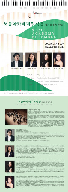 서울 아카데미 앙상블(악장, 바이올린 양승희)이 매년 정기적으로 개최되는 상반기 정기연주회를 예술의전당 IBK챔버홀에서 6월 25일(토요일) 오후 2시에 개최한다. 이번 연주회는 서울 아카데미 앙상블이 주최하고, 한다우리 예술기획이 주관한다. 연주회에서는 서울대학교 음악대학 지휘전공 교수로 재직 중인 장윤성 지휘자를 비롯해 미국의 Troy University John M. Long School of Music 음악대학교 기악과 전임교수로 재직 중인 피아니스트 유욱진, 경성대학교 겸임교수, 인제대학교 및 동대학원, 선화예술중.고...