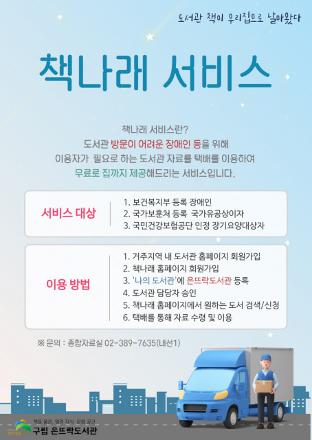 ‘책을 품은, 열린 지식·문화공간’ 구립 은뜨락도서관(관장 김명수)은 국가 상호대차 서비스, 장애인을 위한 도서 택배 대출 ‘책나래’를 지속해서 운영한다고 29일 밝혔다. 책나래 서비스란 도서관 방문 이용이 어려운 장애인에게 우체국 택배를 이용해 도서관 자료(도서 등)를 무료로 집까지 배달 및 수거해주는 서비스이다. 지원 대상은 보건복지부 등록 장애인뿐만 아니라 국가보훈처 등록 국가유공자이자 국민건강보험공단 인정 장기 요양대상자도 무료로 이용할 수 있다. 책나래 서비스를 이용하고 싶은 분들은 은뜨락도서관과 책나래 홈페이지...