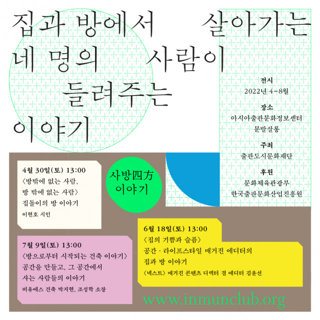 2022 출판도시 인문학당 상반기 자체기획 전시와 강연, ‘사방(四方) 이야기’가 아시아출판문화정보센터 문발살롱(라이브러리스테이 지지향 로비)에서 진행된다. 출판도시문화재단이 주최하고 문화체육관광부, 한국출판문화산업진흥원이 후원하는 2022 출판도시 인문학당 자체기획 전시와 강연은 상반기(4~8월)와 하반기(9~12월) 각각 다른 주제로 진행된다. 상반기 전시 및 강연 주제는 ‘방(房)’이다. 세 번에 걸쳐 진행되는 ‘사방(四方) 이야기’ 강연에서는 각자 다른 분야에서 일하며 여러 지역, 형태의 집에서 살아온 강연자들의 이야...