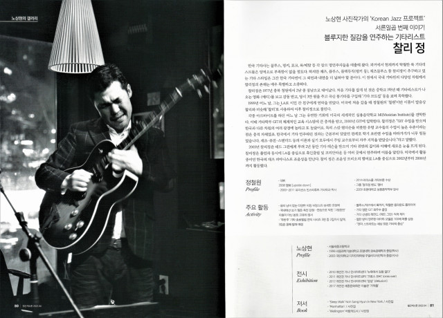 노상현 아티스트가 2022년 월간 색소폰 4월호 노상현의 사진 갤러리에서 기타리스트 찰리정을 소개한다. 한국 기타사는 블루스, 펑키, 포크, 록/메틀 등등 각 장르 명연주자들을 배출해 왔다. 특히 탁월한 록 기타리스트들은 과거에서 현재까지 양적으로도 부족함이 없을 정도다. 하지만 재즈, 블루스, 블랙뮤직(펑키 등), 재즈블루스 등 찰리정이 추구하는 기타 스타일은 그간 한국 기타씬이 그 외연과 내연을 더 넓혀야 할 분야였다. 이 점에서 국내 기타씬의 다양성 차원에서도 찰리정의 존재는 매우 특별하고 소중하다. 찰리정은 1977년...