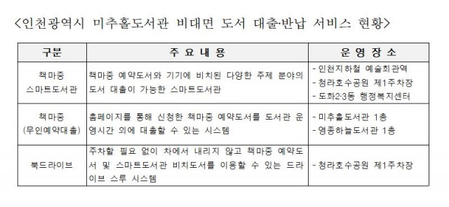 인천광역시미추홀도서관(관장 김원연)이 3월 14일(월)부터 ‘책마중 서비스’를 정식으로 시행한다고 밝혔다. 이번 서비스는 대시민 독서 편의 증진을 위해 지난해 10월에 개소해 운영해오던 도화2·3동 행정복지센터 스마트도서관에서 운영·실시된다. 책마중 서비스는 미추홀도서관에 등록된 회원이 홈페이지와 리브로피아 앱을 통해 소장 중인 도서를 1인 2권까지 신청하면, 직원들이 매주 월요일 및 목요일에 도서를 스마트도서관에 투입해 지정 기간 내 해당 도서를 대출할 수 있다. 특히 책마중 서비스는 기존 스마트도서관의 신간 도서 및...
