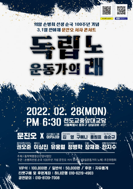 문화콘텐츠유통협동조합은 조합 소속 가수인 문진오가 의암 손병희 선생 순국 100주년 기념 서사 콘서트 ‘독립운동가의 노래’를 개최한다고 24일 밝혔다. 서사 콘서트로 새롭게 구성한 이번 콘서트는 3·1절을 하루 앞둔 2월 28일 오후 6시 30분에 독립운동가들의 삶과 정신을 조명하기 위해 열린다. 특히 1919년 3·1운동의 주역이었던 의암 손병희 선생의 순국 100주년을 기념한다. 민중 가수 문진오는 ‘노래를 찾는 사람들’ 출신 가수로, 오랫동안 약자의 편에 서서 인권과 평화, 정의를 주제로 활동했다. 그는 2019년 ...