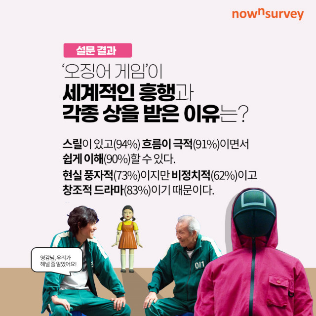 엘림넷 나우앤서베이가 넷플릭스 오리지널 콘텐츠 ‘오징어 게임’을 주제로 진행한 패널 설문 조사 결과를 15일 발표했다. 오징어 게임은 지난해 세계적 인기 속에 넷플릭스 역대 최대 흥행작으로 떠올랐다. 지난 연말 각종 시상식에서 수상 소식을 전하며 인기를 실감하게 했다. 비영어권 드라마로는 처음으로 올 3월 19일 로스앤젤레스에서 열리는 미국제작자조합(PGA)상 후보로 선정됐다. 이에 나우앤서베이는 올 1월 24일부터 2월 4일까지 나우앤서베이 전국 패널 회원 1125명(남성 617명, 여성 508명)을 대상으로 오징어 게임...