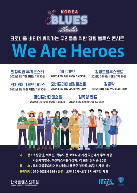 한국블루소사이어티가 3월 7~13일 서울 용산구 소재 코리아블루스씨어터에서 힐링 블루스 콘서트를 개최한다고 10일 밝혔다. 총 7일 일정으로 진행되는 힐링 블루스 콘서트는 한국블루스소사이어티가 주최하고, 한국콘텐츠진흥원 후원으로 기간 중 총 8회 오프라인 공연으로 열린다. 앞으로 녹화본은 편집을 거쳐 유튜브 ‘최항석의 블루스채널’에 게재된다. 코로나를 이겨내는 우리가 영웅입니다 ‘WE ARE HEROES’ 힐링 블루스 콘서트는 의료진, 소방공무원, 자영업자 등 코로나19로 힘든 시기를 이겨내기 위해 노력하는 여러 분야의 종사...