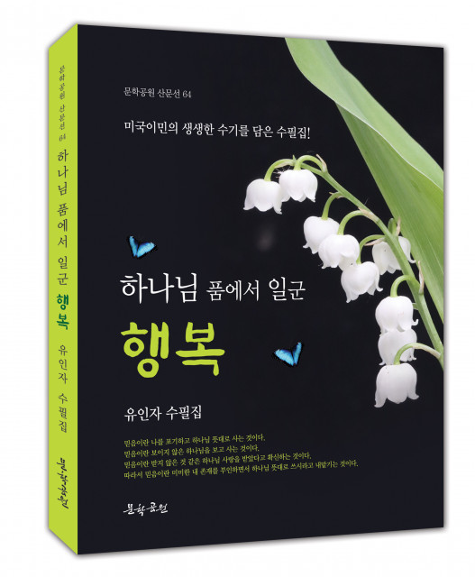 도서출판 문학공원은 반세기 동안 미국에서 살아온 유인자 수필가(미국 이름 janis Kennedy)가 첫 수필집 ‘하나님 품에서 일군 행복’을 펴냈다고 3일 밝혔다. 1939년 전라북도 김제에서 태어난 유인자 수필가는 전북 군산간호대학을 졸업했다. 서울보건대야간대학원에 합격했으며 임실군보건소 보건계몽강사를 시작으로 서울 중구보건소, 종로보건소, 마포보건소에서 간호사로 일했다. 이후 1973년 5월 미국으로 이민 가 Nursing Home에서 전공을 살려 간호사로 일했으며, 드라이크리닝 사업으로 성공한 인생을 살아왔다. 이 수필...