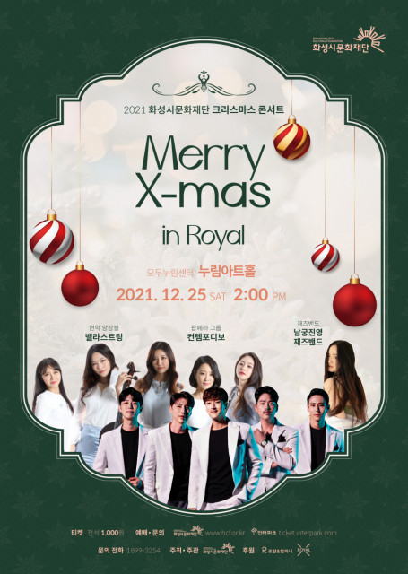 화성시문화재단(대표이사 이종원)이 12월 25일(토) 오후 2시 모두누림센터 누림아트홀에서 크리스마스 콘서트 ‘Merry X-mas in ROYAL’를 개최한다고 22일 밝혔다. 크리스마스 콘서트 ‘Merry X-mas in ROYAL’은 화성시문화재단이 주최·주관하며, 욕실제품 전문업체 로얄앤컴퍼니가 후원하는 공연이다. 코로나19 장기화로 얼어붙은 사회적 분위기를 공연예술로 치유하고, 화성시민들의 공연 관람 문턱을 낮추기 위해 화성시문화재단이 크리마스에 특별 기획한 ‘천원의 행복’ 공연이다. 이번 크리스마스 콘서트는 저렴...