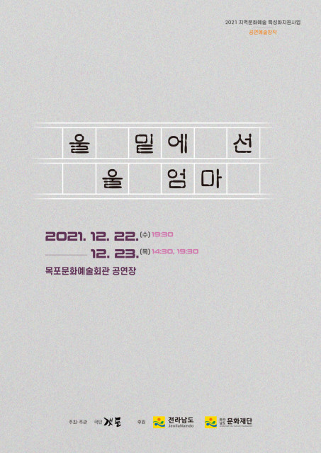 목포 고아들의 어머니 ‘윤학자(1912~1968) 여사’의 생애를 담은 창작극 ‘울 밑에 선 울 엄마’가 12월 22일(수)~23일(목) 목포시 목포문화예술회관 공연장에서 목포시민들을 만난다. 이번 공연은 ‘2021 지역문화예술특성화지원사업-공연예술창작’의 하나로 극단갯돌이 주최·주관하며, 전라남도 및 전라남도 문화재단이 후원해 진행한다. 이 작품은 일본인이지만 3000여명의 한국 고아를 키워낸 윤학자(다우치 치즈코) 여사의 생애를 다룬 작품으로 일제 강점기, 한국 전쟁, 근대화의 대격변 시기와 함께 굴곡진 삶을 살아 온...