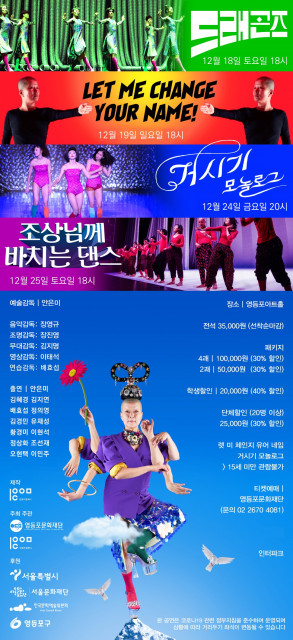 영등포문화재단(대표이사 강원재)이 공연장 상주단체 안은미컴퍼니의 ‘4괘’ 공연을 18일부터 19일, 24일부터 25일까지 총 4일간 영등포아트홀에서 선보이고 공연 이후 유튜브에서 영상을 감상할 수 있는 온라인 레퍼토리 주간을 개최한다. 한국을 대표하는 현대 무용 단체로, 2021년에도 벨기에, 프랑스, 독일, 스위스 등 3개월에 걸친 유럽투어를 마치고 돌아온 안은미컴퍼니가 150여 편의 레파토리 중 베스트 4개 작품을 선보인다. ‘드래곤즈’, ‘렛 미 체인지 유어 네임’, ‘거시기 모놀로그’, ‘조상님께 바치는 댄스’ 총 4개...