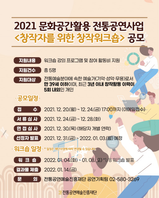 전통공연예술진흥재단(이사장 정성숙)은 창작에 대해 고민하는 젊은 창작자들의 예술 활동을 지원하기 위해 ‘창작자를 위한 창작워크숍’ 공모 접수를 12월 20일(월)부터 12월 24일(금)까지 진행한다. 전통공연예술진흥재단은 ‘문화공간활용 전통공연’ 사업을 통해 문화공간과 융합한 다양한 전통창작공연을 지원하고 있다. 이번 공모는 코로나19 이후 변화된 공연예술 생태계에 맞는 새로운 지원책 모색을 위해 시범사업으로 추진한다. 코로나19 이후 공연예술계는 영상 제작과 같은 다양한 융합 작업이 펼쳐지고 있지만 이러한 경험은 일부 예술...