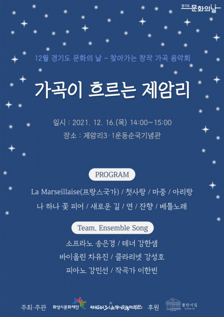 화성시문화재단(대표이사 이종원) 제암리3.1운동순국기념관이 12월 경기도 문화의 날을 맞아 찾아가는 창작 가곡 음악회 ‘가곡이 흐르는 제암리’를 12월 16일(목) 오후 2시 시청각실에서 개최한다고 밝혔다. 피아니스트 등 전문 연주자와 성악가로 구성된 ‘불란서집 문화예술기획’과 협업으로 진행되는 이번 공연은 ‘가곡이 흐르는 제암리’라는 주제로 시와 K-가곡에 대한 재미있는 해설이 곁들여져 보다 쉽고 친숙하게 관객들에게 다가갈 예정이다. 공연단체 불란서집 문화예술기획은 전문연주자들로 구성된 실력파 청년들로 △소프라노 송은경 △...
