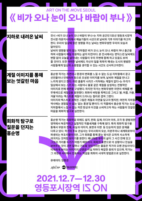 영등포문화재단이 영등포시장역 내 문화공간 라운지사이에서 12월 7일부터 30일까지 무료로 관람할 수 있는 전시 ‘비가 오나 바람이 부나: 지하에는 계절이 없다’를 개최한다. 이번 전시는 지역 예술가의 시선으로 날씨와 기후를 이야기하고자 하는 홍순명 작가의 회화 전시로 변덕스러운 날씨에도 변함없이 자신의 일을 묵묵히 해내는 사람들에게 일상의 소중함을 선사하고자 한다. 전시가 열리는 영등포시장역은 1996년 개통 이후 20년 이상 지나 노후화된 지하철역 유휴공간을 리모델링해 지난해 7월 31일 오픈했다. 역사 내 예술 작품 전시...