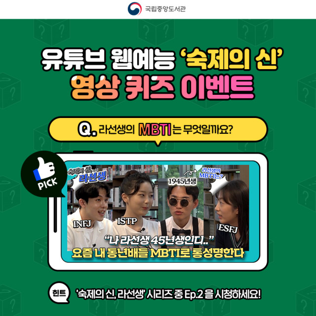 국립중앙도서관은 웹예능 시리즈 ‘숙제의 신, 라선생’을 공식 유튜브 채널에 공개하고, 2차 이벤트로 영상 퀴즈 이벤트를 진행한다고 1일 밝혔다. 7일까지 진행되는 ‘유튜브 영상 퀴즈 이벤트’는 ‘숙제의 신, 라선생’ 2부 영상을 끝까지 시청한 뒤 간단한 퀴즈를 풀어 응모하는 방식으로 운영된다. 퀴즈 정답은 단답형으로, 정답을 맞힌 참가자 가운데 3명을 추첨해 백화점 상품권(3만원권)을 증정한다. 자세한 참여 방법은 국립중앙도서관 공식 블로그 및 소셜 미디어를 통해 확인할 수 있다. 숙제의 신, 라선생은 미스터리한 인물인 ‘라...