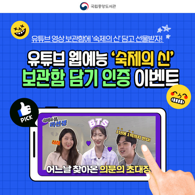 국립중앙도서관은 웹예능 시리즈 ‘숙제의 신, 라선생’을 공식 유튜브 채널에 공개하고, 영상 보관함 담기 인증 이벤트를 진행한다고 26일 밝혔다. ‘숙제의 신, 라선생’은 미스터리한 인물인 ‘라선생’의 초대를 받아 도서관을 방문하게 된 세 명의 참가자가 그 안에서 다양한 미션 대결과 열띤 수다를 펼치는 내용의 에듀테인먼트(Edutainment)형 웹예능이다. 누구나 하나쯤 가지고 있는 고민이나 관심사를 ‘인생의 숙제’로 상정하고, 이를 참가자들이 함께 고민하고 풀어나가는 스토리로, 선한 영향력, MBTI, 레이어드홈, 가치소비...