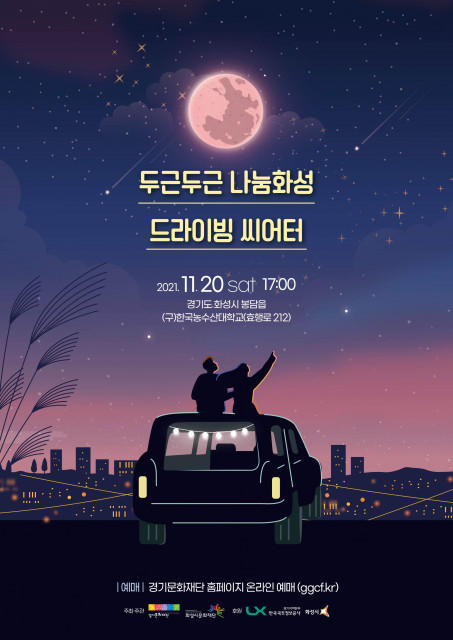 화성시문화재단(대표이사 이종원)은 11월 20일(토) 오후 5시부터 경기도 화성시 봉담읍 소재 (구)한국농수산대학교에서 ‘두근두근 나눔화성, 드라이빙 씨어터’를 개최한다. 두근두근 나눔화성, 드라이빙 씨어터(이하 드라이빙 씨어터)는 위드 코로나 시대를 맞아 그동안 강도 높은 사회적 거리 두기로 문화 예술을 향유할 기회가 적었던 도민들을 위해 화성시문화재단과 경기문화재단이 공동으로 주최하고, 화성시와 한국국토정보공사(경기지역본부)가 후원하는 비대면 드라이브-인 공연이다. 안전한 관람 환경을 위해 모든 공연 관객은 차량 내부에...