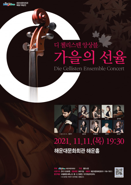 해운대문화회관(관장 김영순)은 특별 기획으로 디 첼리스텐 앙상블의 첼로 앙상블 ‘가을의 선율’ 공연을 11월 11일(목) 저녁 7시 30분 해운홀에서 진행한다. 이번 공연은 첼로가 지난 매력적이고 묵직한 음색으로 정통 클래식부터 현대에 이르기까지 시대·장르를 아우르는 다양한 레퍼토리를 대중에게 보여주는 첼로 앙상블의 공연이다. ‘첼로를 하는 사람들’이라는 뜻을 지닌 디 첼리스텐(Die Cellisten Ensemble)은 부산, 대구, 울산 및 경남 음악계에서 활발히 활동하는 부산의 대표 앙상블팀이다. 리더 정준수를 중심...