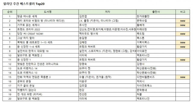 알라딘 인터넷서점은 소설가 김초엽의 신작 소설집 ‘방금 떠나온 세계’가 인터넷 서점 알라딘 베스트셀러 1위에 올랐다고 28일 밝혔다. ‘우리가 빛의 속도로 갈 수 없다면’ 이후 2년여 만에 출간된 김초엽 작가의 두 번째 소설집 ‘방금 떠나온 세계’는 제11회 젊은 작가상 수상작인 ‘인지 공간’, 2021 올해의 문제소설 ‘오래된 협약’ 등 2년간 새로 쓴 7편의 소설이 담겨 있다. 김초엽 작가의 ‘방금 떠나온 세계’는 타자에 대한 깊은 사유에 더해 세심한 관찰자로서 낯선 우주 저편의 이야기를 김초엽만의 세계 안에 온전히 담아...
