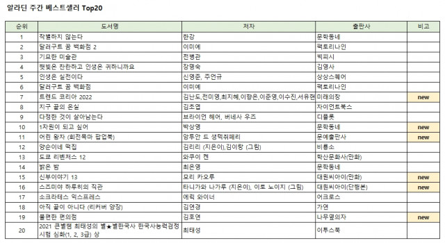 알라딘 인터넷서점은 한강 작가의 새 장편소설 ‘작별하지 않는다’가 9월 4주 주간 베스트셀러 1위에 올랐다고 30일 밝혔다. 그 외에도 ‘트렌드 코리아 2022’와 박상영 신작 소설 ‘1차원이 되고 싶어’가 예약 판매 기간 중 베스트셀러 10위 이내에 진입했다. ‘작별하지 않는다’는 한강 작가가 2016년 부커상 수상 후 5년 만에 펴낸 장편 소설로 5.18 광주 민주화 항쟁을 다룬 ‘소년이 온다’에 이어, 한국사의 또 다른 비극인 제주 4.3사건을 이야기한 책이다. 출간 이후 독자들의 호평을 받으며 높은 판매가 꾸준히 이어...