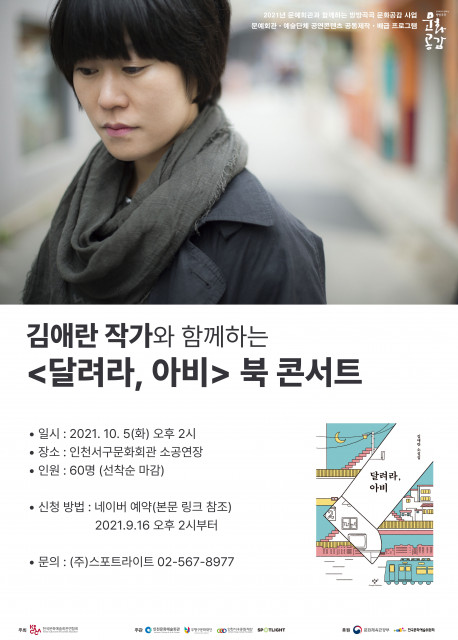 우리 시대 최고의 작가로 손꼽히는 김애란 작가가 10월 5일 인천 서구문화회관 소공연장에서 ‘달려라, 아비’ 북 콘서트로 팬들과 만난다. 북 콘서트는 10월과 11월 인천 지역 3개 극장에서 개최되는 연극 ‘달려라, 아비’ 공연을 기념해 개최되는 행사다. 김애란 작가는 소설가의 삶과 소설 달려라 아비에 관한 이야기를 통해 관객들과 호흡할 예정이다. 예약은 네이버 예약 페이지에서 할 수 있으며 코로나 상황을 고려해 선착순 60명으로 마감된다. 달려라, 아비는 김애란 작가가 2005년 발표한 단편소설로, 김애란 마니아들 사이에...