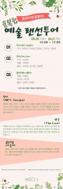 종로사회적경제네트워크사회적협동조합(이사장 이학송, 이하 종로사협)은 코로나19로 위축된 문화 예술 활성화를 위해 종로구 문화 예술 사회적 경제 기업들과 함께 6월 문을 연 종로여가에서 전시·연극·무용을 감상할 수 있는 예술 랜선투어를 진행한다. 예술 랜선투어는 8월 26일(목)~27일(금)까지 이틀간 오후 3시~5시에 진행할 예정이다. △미디어 아트 전시 △버라이어티 라이브 공연 △전통 무용이 함께 어우러지는 장을 유튜브 채널 ‘종로문예투어리즘’에서 실시간 라이브로 감상할 수 있다. 자세한 내용은 종로여가 인스타그램과 종...