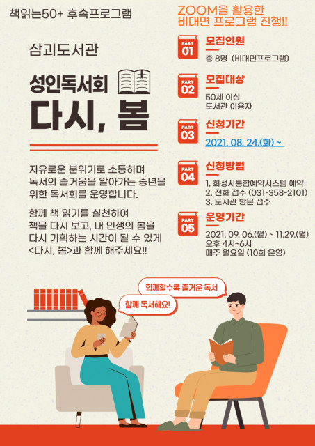 화성시문화재단은 신중년을 위한 ‘책읽는 50+’ 후속 프로그램 참여자를 모집한다고 25일 밝혔다. ‘신중년’은 자기 자신을 가꾸고 인생을 행복하게 살기 위해 노력하며 젊게 생활하는 중년을 이르는 단어로, 노년기를 적극적으로 준비하는 세대를 말한다. 책읽는 50+란 점차 증가하는 신중년층을 대상으로 독서문화 활동을 지원하고자 화성시 도서관에서 올해 신규 운영하는 사업이다. 독서문화 활동을 바탕으로 노년기 인생을 설계하고 사회 참여를 더욱 풍부하게 할 수 있도록 책 꾸러미를 배부하고 있다. 대상은 화성시 거주 50세 이상 시민...
