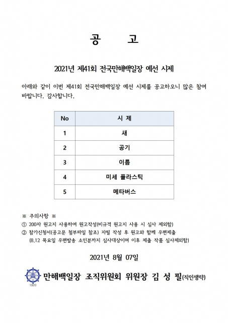 사단법인 대한불교청년회와 경상북도가 공동주최하는 제41회 전국만해백일장 예선이 시작됐다고 밝혔다. 올해 백일장은 예선과 본선으로 나눠서 진행되고 예선은 우편접수로 참가할 수 있으며, 본선은 9월 4일(토) 경상북도청 동락관에서 현장 진행된다. 전국의 중·고등학생, 대학생, 일반인들이 참가하는 이번 대회는 시·시조와 산문 분야로 나눠서 진행된다. 또한 대회에서는 △대통령상 △국회의장상 △장관상 등이 수여 될 예정이며 총 600여만원의 상금도 지급될 예정이다. 제41회 전국만해백일장에 관한 자세한 내용은 공고문을 ...