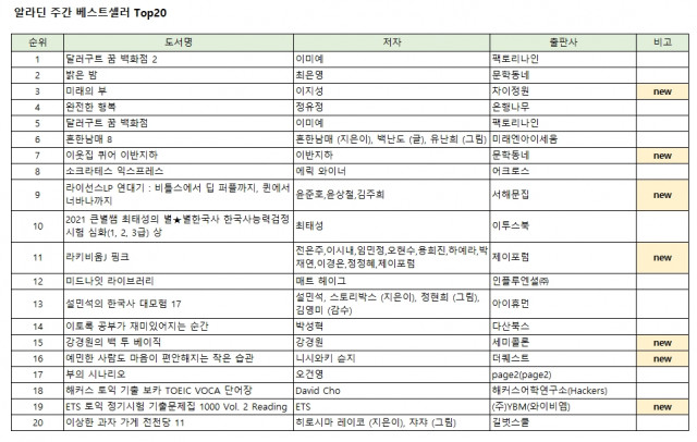 인터넷 서점 알라딘은 이미예 장편소설 ‘달러구트 꿈 백화점 2’이 2주 연속 알라딘 주간 베스트셀러 1위에 올랐다고 밝혔다. 종이책+전자책 합산 누적 독자 100만 명을 기록하며 상반기 전 서점가 베스트셀러 1위를 기록한 ‘달러구트 꿈 백화점’ 전 편의 인기를 후편에서도 이어가고 있는 것으로 나타났다. 2권의 판매량에 힘입어 ‘달러구트 꿈 백화점’ 1권 역시 베스트셀러 5위에 오른 것으로 나타났다. 지난주 4위를 기록했던 최은영 작가의 ‘밝은 밤’과 3위를 기록했던 정유정 작가의 ‘완전한 행복’은 각각 베스트셀러 2위, 4위를...