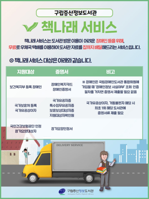 구립증산정보도서관(관장 김숙경)은 국립장애인도서관과 협력해 도서관 방문에 어려움이 있는 이용자를 위해 도서관 자료를 집까지 무료로 배달하는 책나래 서비스를 지속해서 운영하고 있다고 밝혔다. 책나래 서비스 이용 대상은 장애인·국가유공상이자·장기요양 대상자이며, 신청을 위해서는 지역 도서관과 책나래 홈페이지 두 곳에 회원 가입을 진행하고 책나래 홈페이지에서 인증 절차를 걸치면 된다. 국가유공자나 장기요양대상자의 경우 도서관에 증명서를 제출하면 완료된다. 1회당 5권까지 배송기간을 포함해 30일간 이용할 수 있으며, 책나래 서...
